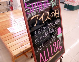 5月9日は、「アイスの日」です! ミラノは、5月9、10日の2日間、 シングルカップ全品180円! (とりせん駐車場にて販売) 店内でも、シングルカップ180円 シングルコーン200円で販売します。 チーフが書いたブラックボードの文字に 勢いを感じます・・・!!(^^)