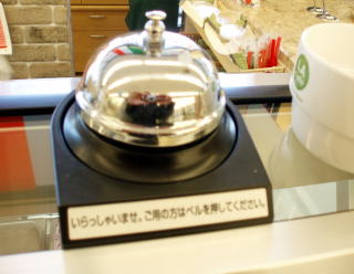 店頭に、人がいない時は、 だいたい、 裏でコーン焼いたり、 練乳いちご作ったりしています。 そんな時は! このベルで、お呼びくださーい!