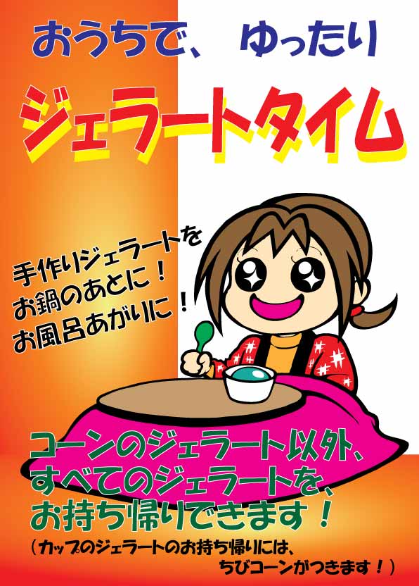 メニューやポスター担当のデザイナーさんの今のお気に入りは、 「アピタパソコン教室の先生のブログ」の パソコンのマメ知識コーナーだとか。 ちょっとしたパソコンの小ワザがのってて、 さりげなく使うと自慢できるらしい・・・ (自慢かよ・・・) アピタパソコン先生ブログは、ここから入って、 「群馬情報」上位1~3位あたりにありますよ~ん。(^^;) ↓ ちなみに、おすすめジェラートは、 「くろごま」だそうです。 ケンコーこそ、感性の命!だそうです。