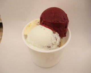 「トリプル」です! 紅のジェラートは「カシス」です! 色合いといい、味覚といい、 “キール”を思わせるような、 大人のジェラートです! (ノンアルコールです) 上品な紅のジェラートです・・・!
